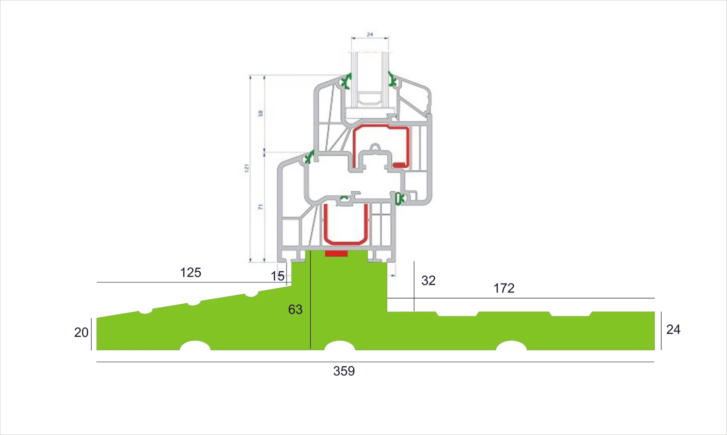 Kolorem czerwonym na rysunku przekroju oznaczono miejsce wklejenia taśmy rozprężnej szer. 15 mm podczas montażu.