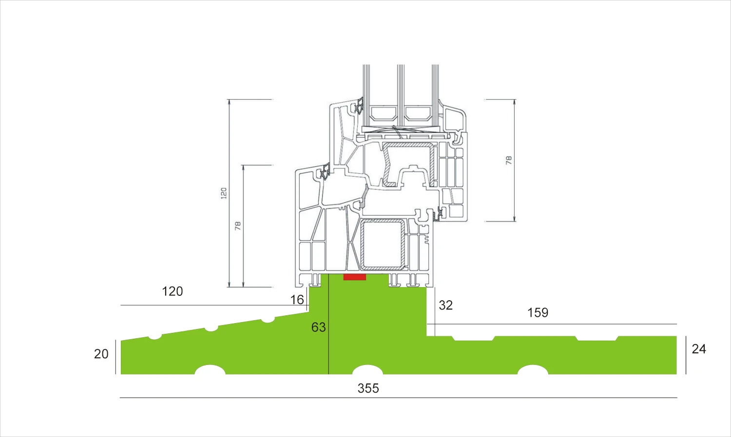 Kolorem czerwonym na rysunku przekroju oznaczono miejsce wklejenia taśmy rozprężnej szer. 15 mm podczas montażu.