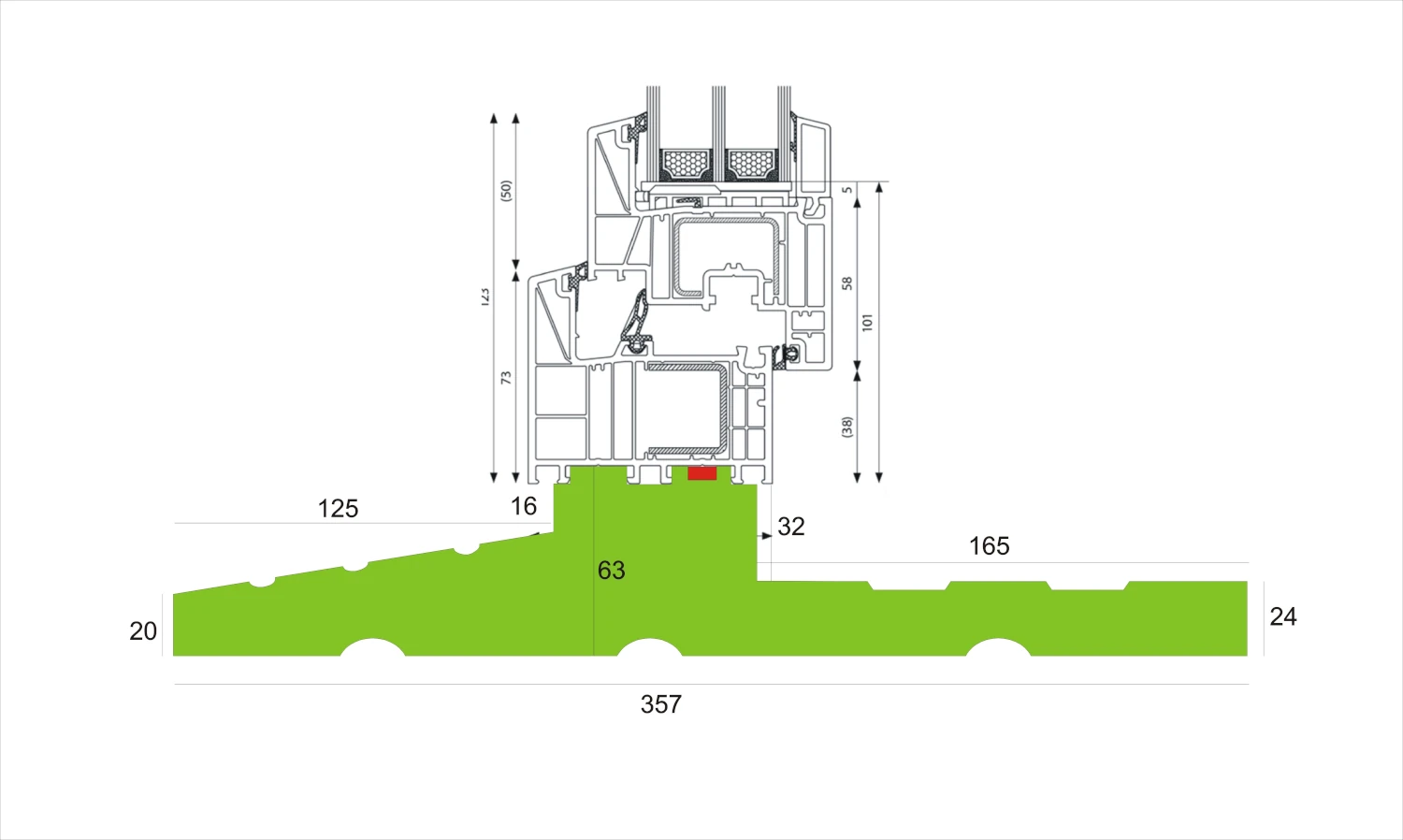 Kolorem czerwonym na rysunku przekroju oznaczono miejsce wklejenia taśmy rozprężnej szer. 10 mm podczas montażu.