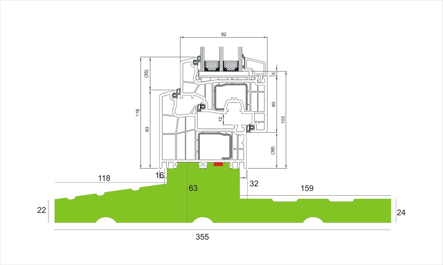 Kolorem czerwonym na rysunku przekroju oznaczono miejsce wklejenia taśmy rozprężnej szer. 10 mm podczas montażu.