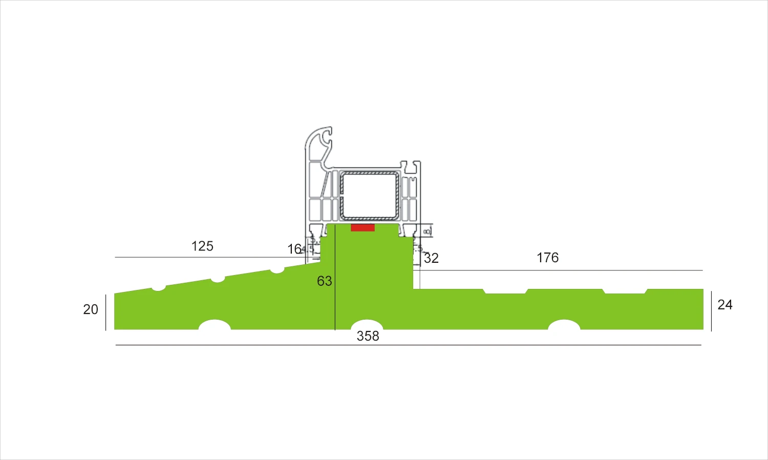 Oferujemy również profile alternatywne tj. nie tylko ciepłe parapety dwustronne, ale również jednostronne (np. do okien piwnicznych, gdzie z reguły nie montuje się parapetów wewnętrznych lub zewnętrznych) czy profile pod same ramy okien, a zwłaszcza drzwi różnego typu. Kolorem czerwonym na rysunku przekroju oznaczono miejsce wklejenia taśmy rozprężnej szer. 15 mm podczas montażu.