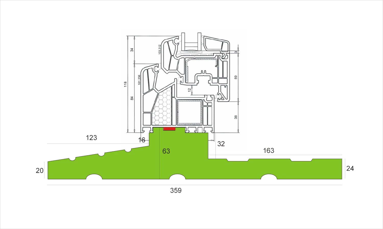 Kolorem czerwonym na rysunku przekroju oznaczono miejsce wklejenia taśmy rozprężnej szer. 15 mm podczas montażu.