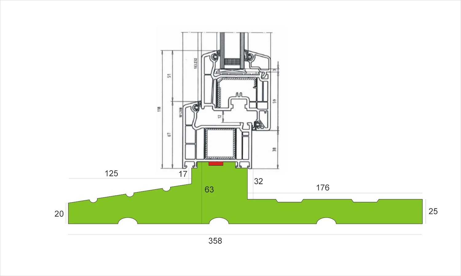 Kolorem czerwonym na rysunku przekroju oznaczono miejsce wklejenia taśmy rozprężnej szer. 10 mm podczas montażu.