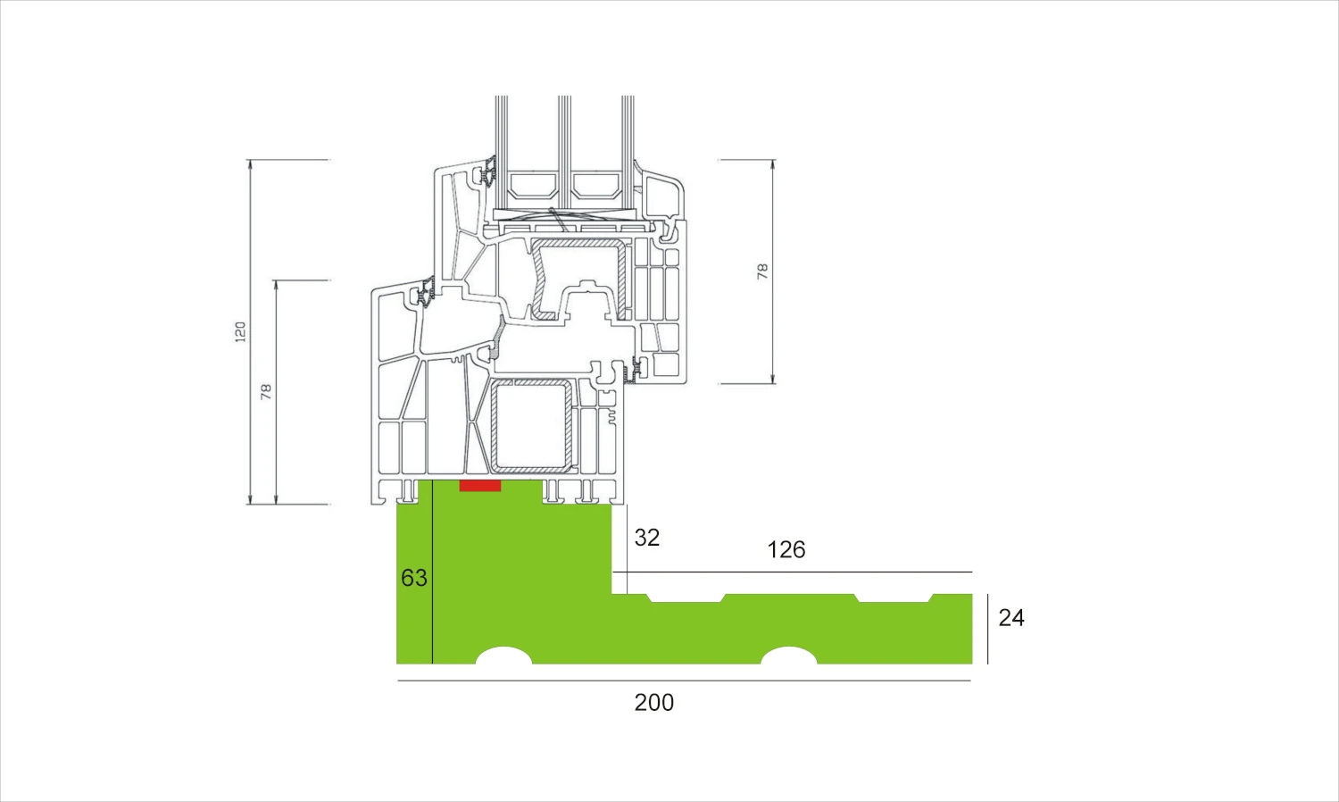 Kolorem czerwonym na rysunku przekroju oznaczono miejsce wklejenia taśmy rozprężnej szer. 15 mm podczas montażu.