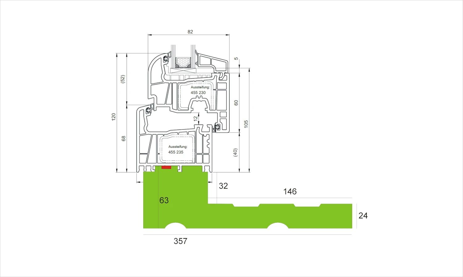 Kolorem czerwonym na rysunku przekroju oznaczono miejsce wklejenia taśmy rozprężnej szer. 15 mm podczas montażu.