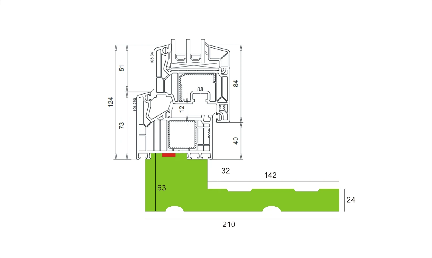 Kolorem czerwonym na rysunku przekroju oznaczono miejsce wklejenia taśmy rozprężnej szer. 15 mm podczas montażu.
