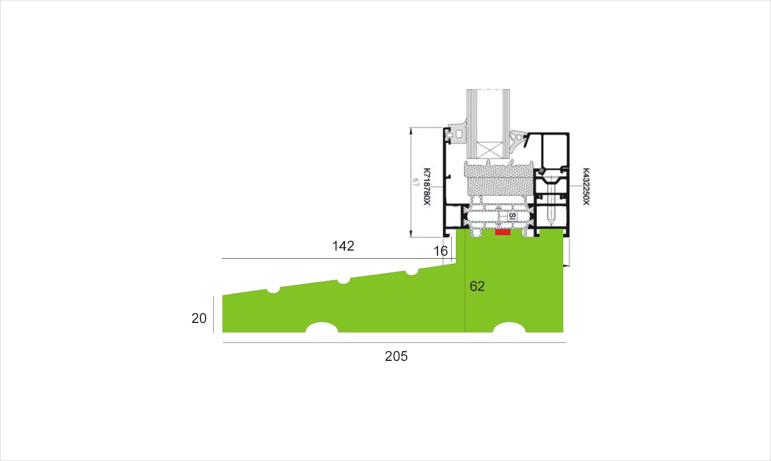 Profil doskonale izoluje i uszczelnia przestrzeń pod oknami. Stosowany pod ramę okienną i stanowi oparcie pod parapet zewnętrzny, gdzie został wykształcony już spadku ok.7%-9%. Profile umożliwiają montaż najbardziej popularnych parapetów zewnętrznych z blachy lub aluminium oraz innych systemów i parapetów wewnętrznych o grubości ponadstandardowej. Profile takie eliminują problem przedmuchów między oknem, a parapetem i likwidują powstawanie w tych miejscach mostków termicznych, ograniczają zatem w znaczący sposób straty ciepła i zapobiegają powstawaniu zawilgoceń. Profil może być nieznacznie modyfikowany w zakresie wymiarów zewnętrznych.
