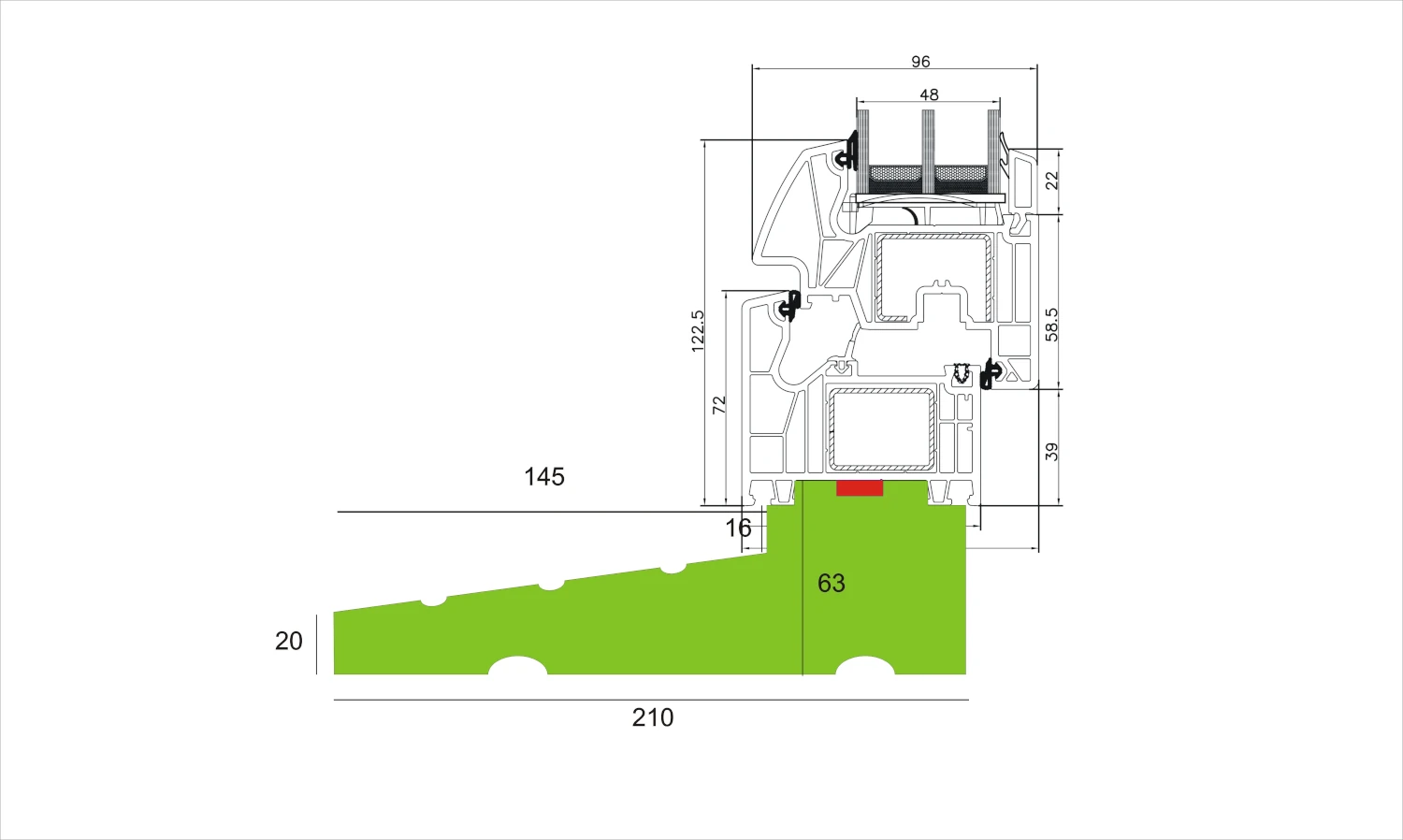 Kolorem czerwonym na rysunku przekroju oznaczono miejsce wklejenia taśmy rozprężnej szer. 15 mm podczas montażu.
